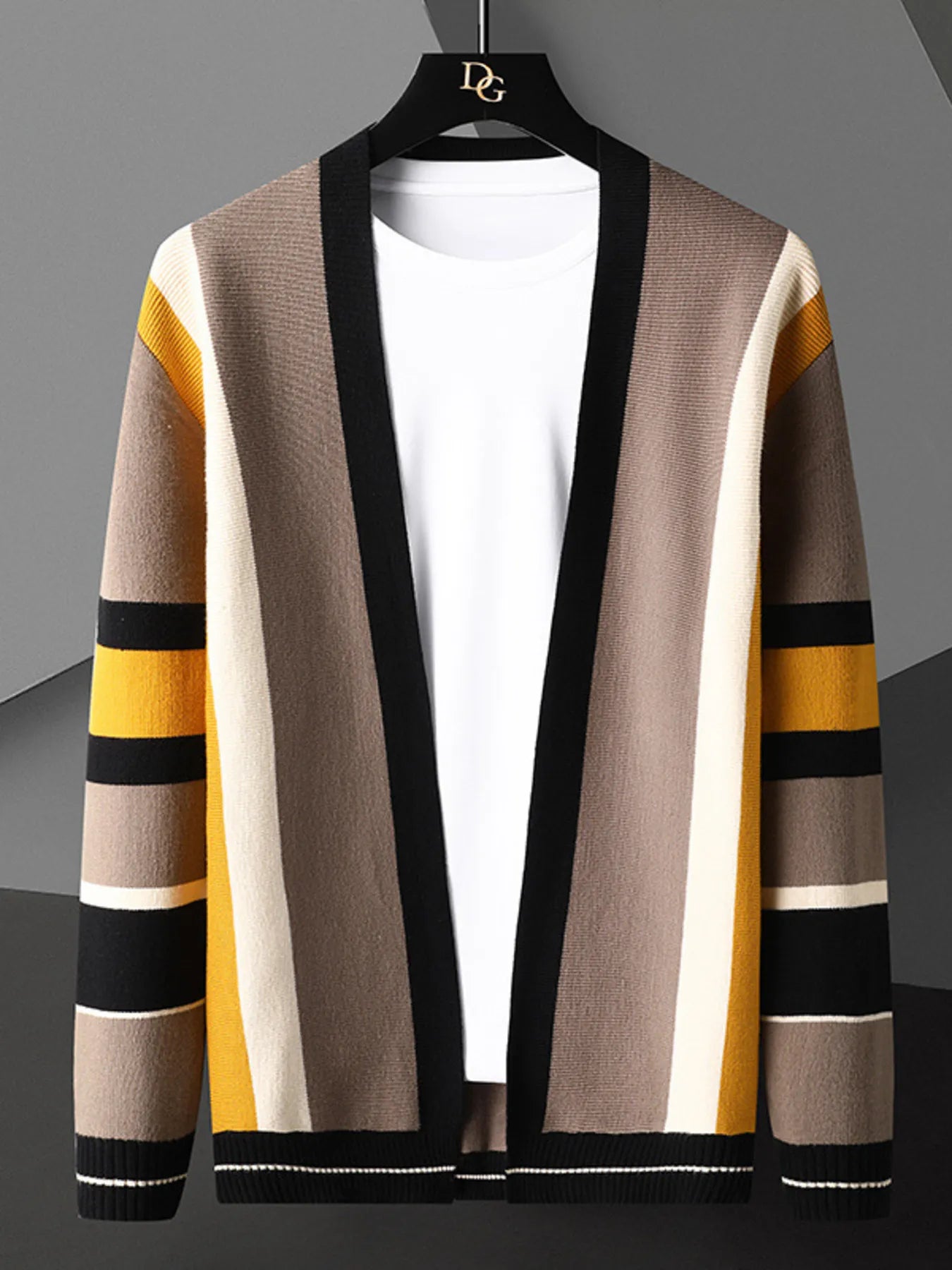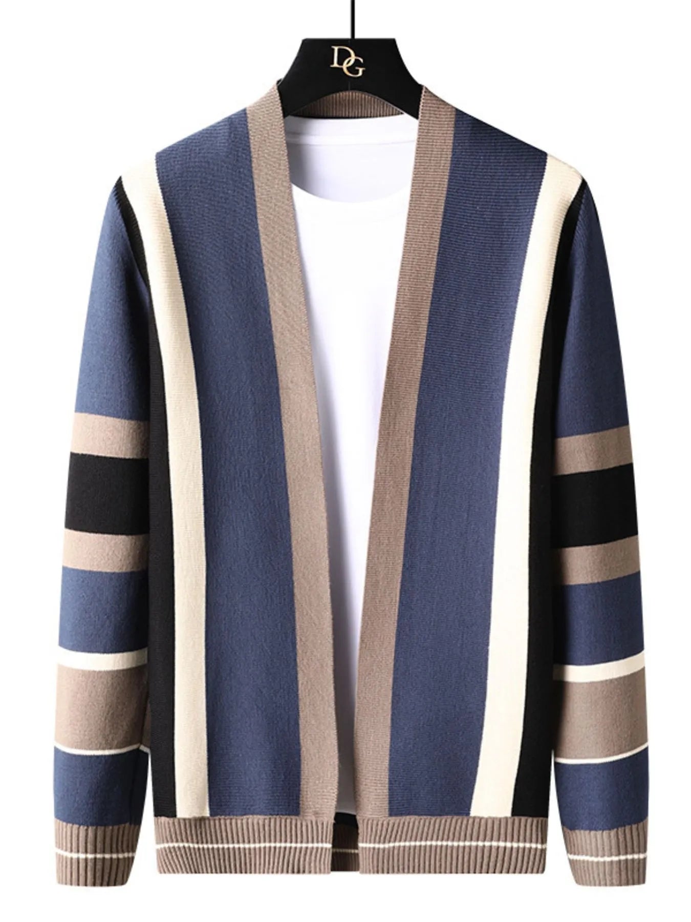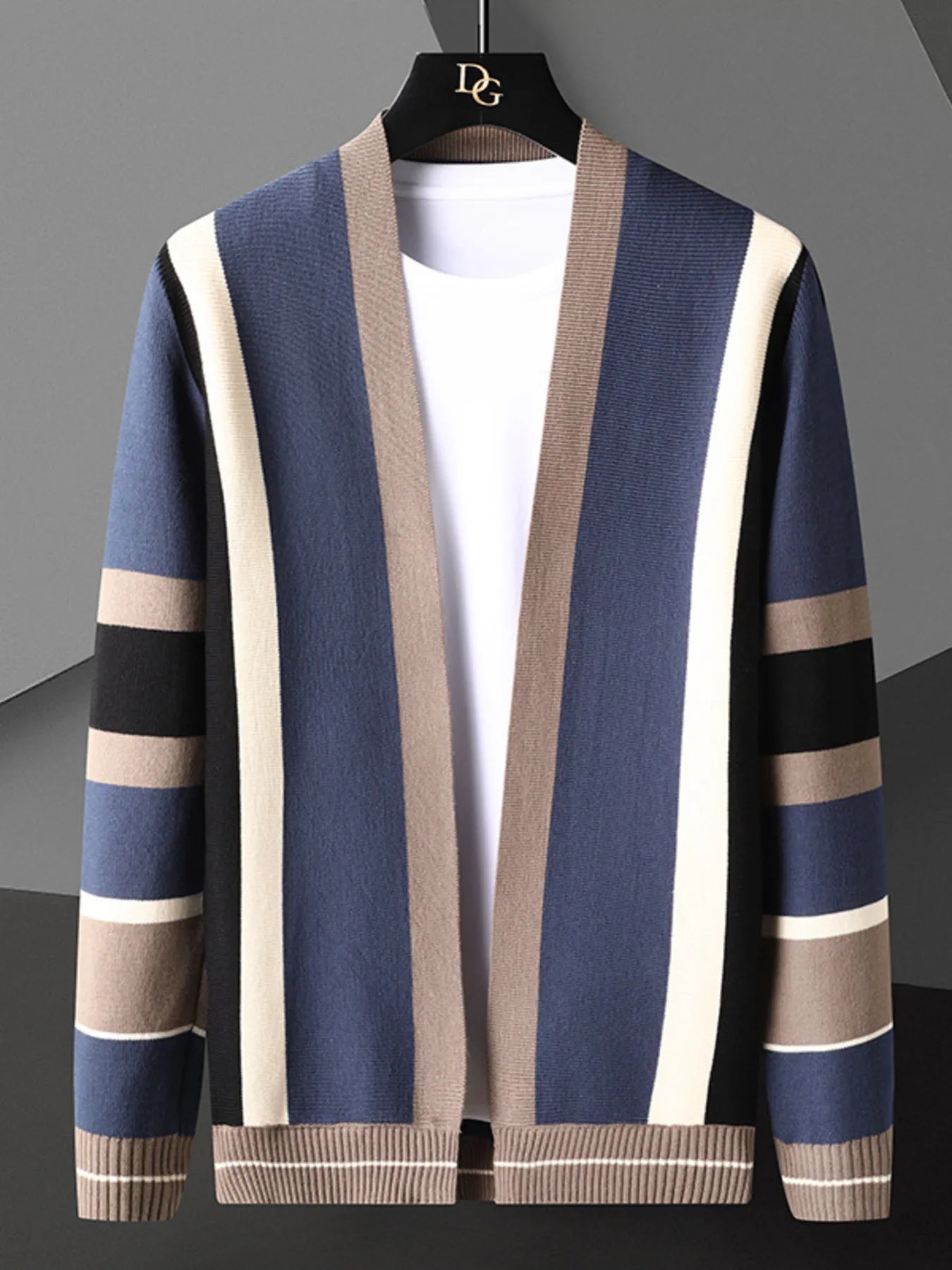 A stylish open-front knit cardigan with a striped pattern and ribbed design. Made from a polyester-spandex blend with slight stretch, perfect for layering and casual wear.